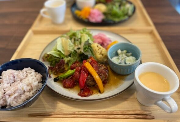特に日替わりランチは、季節の野菜をふんだんに使ったおかずが数品並び、見た目にも鮮やか。カフェタイムにはパウンドケーキや冷やし焼き芋などのデザートも楽しめます。