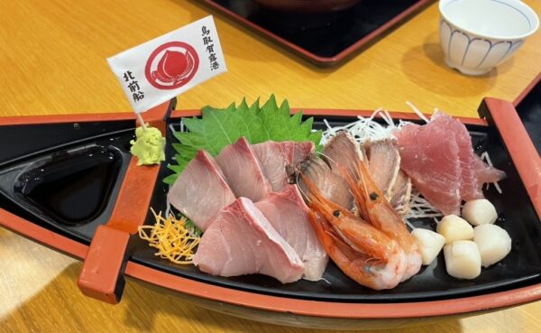 看板メニューの「北前船定食」は、刺身の船盛が付いた豪華な定食で、旬の魚介が日替わりで登場。海の幸を存分に堪能できる一番人気のセットです。
