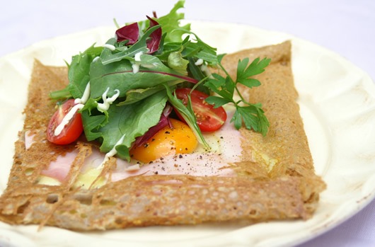 人気メニューの「ガレット」は、パリッと焼き上げた香ばしい生地に、生ハム・サラダ・半熟卵・チーズをトッピングした一皿。見た目も華やかで、素材の相性が抜群です。「ノルウェー(スモークサーモンとクリームチーズ)」や「プロヴァンス(生ハムとラタトゥイユ)」など種類も豊富。