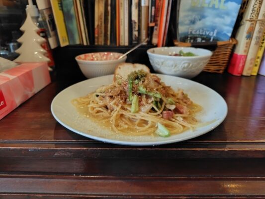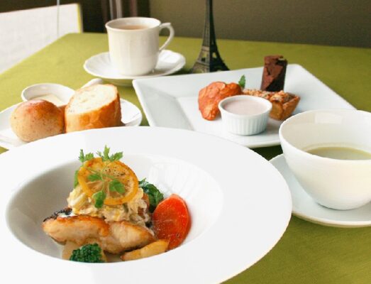 そのほか「小エビと季節野菜のバジルクリームパスタ」や「きのこのボロネーゼパスタ」、自家製パンや季節のサラダも人気。フレンチのエッセンスを取り入れたランチやスイーツが楽しめる、女子会やデートにもおすすめのカフェです。