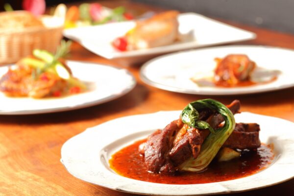 「ローストポークのオニオンソース」や「鶏肉と青ネギのオイルソースパスタ」など、素材の持ち味を活かした料理が並びます。デザートも手作りで、最後まで上品な味わいを堪能できます。