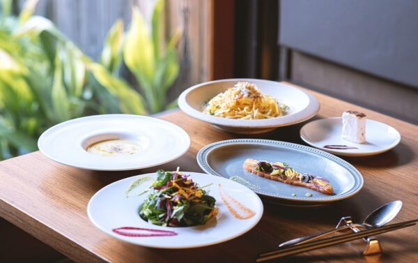 前菜には「パレットサラダ」や「焼きとうもろこしのポタージュ」など、季節感あふれる華やかなメニューが並び、メインは「鯛出汁クリームパスタ」や「アンガス牛ステーキ」などを選択可能。どの料理も美しい盛り付けと上品な味わいが特徴です。