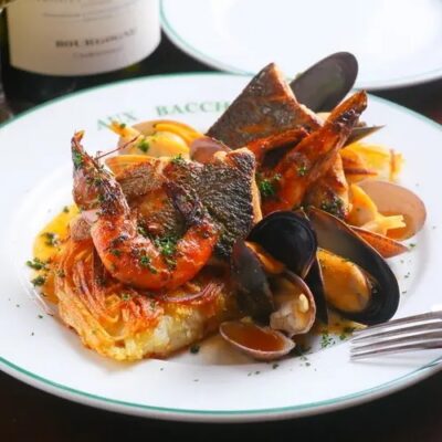京都市下京区・烏丸通沿いの「AUX BACCHANALES 京都」は、パリのブラッセリーを思わせる重厚感ある空間で、本格的なフレンチが気軽に楽しめる人気ビストロ。