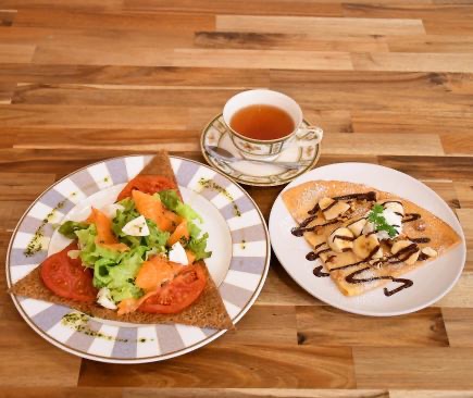 ランチは「コンプレット」や「アスパラ・ベーコン」「アンチョビ・トマト」など、好みのガレットを選べるスタイル。さらにミニクレープとドリンクが付くお得なセットも人気です。