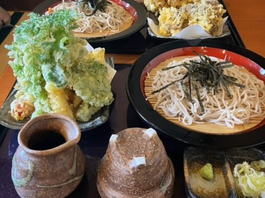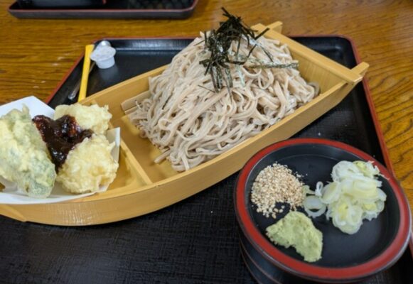 秩父鉄道長瀞駅から徒歩1分、長瀞駅前商店街の中心に位置する蕎麦専門店です。宝登山神社参道と国道140号線が交わる長瀞駅前交差点の大鳥居が目印で、古き良き和の佇まいが特徴のお店です。たじまの最大の魅力は、何と言っても驚愕の山盛り天ぷらです。天ざるそばに乗る天ぷらは約20種類以上、高さ25センチメートル以上にも及ぶ爆盛りで、海老、玉ねぎ、かぼちゃ、なす、さつまいも、しいたけ、トマト、ゴーヤ、蓮根、レンコン、インゲン、舞茸、パプリカなど季節の野菜を中心に、職人技で丁寧に揚げられています。蕎麦は幌加内産の二八そばで、のど越しの良さとコシが特徴。1600円というリーズナブルな価格でこのボリュームは、長瀞観光での昼食に最適です。食べきれない場合はテイクアウトもできます。