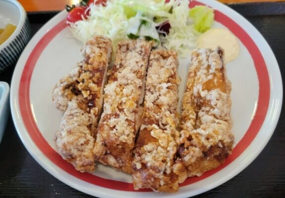 上高地のシンボル河童橋のたもと、上高地のおみやげや2階に位置するセルフサービス式のレストランです。バスターミナルから徒歩数分、河童橋を渡ってすぐという抜群の立地で、上高地散策の休憩スポットとして多くの観光客や登山客に利用されています。店内は約100席を備えた広々とした空間で、窓際のカウンター席からは河童橋や穂高連峰の絶景を眺めることができ、雄大な景色を楽しみながらランチタイムを過ごせるのが最大の魅力です。ランチメニューは、特製のタレに漬け込んでカリッと揚げた鶏もも肉がボリューム満点の名物山賊定食や、五千尺ホテル上高地の料理長が監修したスパイシーポークカレーなど、親しみやすい定番メニューが豊富に揃っています。食券制のシステムで気軽に利用でき、家族連れからソロハイカーまで幅広い層に対応しているお店です。