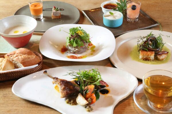 前菜・スープ・魚料理・肉料理・デザートまで、それぞれが美しく仕上げられ、色彩や香り、味の移り変わりも楽しめる構成。