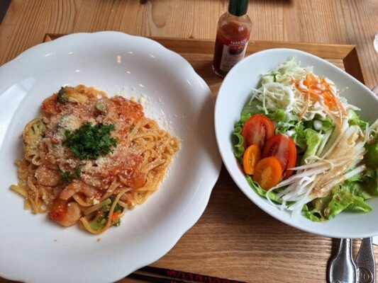 パスタセットは、自家製ソースを使った生パスタが中心で、写真からももちもちとした食感が伝わる一皿。海老のトマトクリームやカルボナーラなど、人気の味がそろっています。