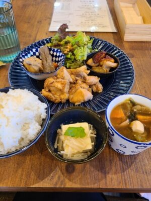 ランチは日替わりで、黒板に書かれたメニューからその日の楽しみが広がるスタイル。生姜焼きやほうれん草の玉子とじ、やっこ、トマト、ご飯、がんも煮、サラダなど、体に優しいおかずが並び、バランスの良い食事ができるのも魅力です。