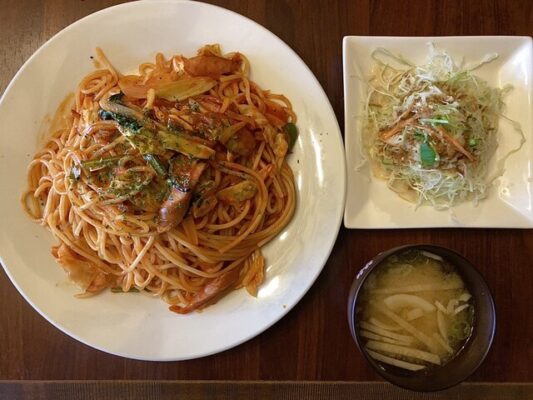 ランチはサラダ・スープ・ドリンク付きで、驚くほどコスパが良いと口コミでも高評価。スパゲッティやカレー、ピラフなど、写真からもボリューム感がしっかり伝わるメニューが揃い、“1.5人前の量”と評判になるほど満足度の高い一皿が楽しめます。