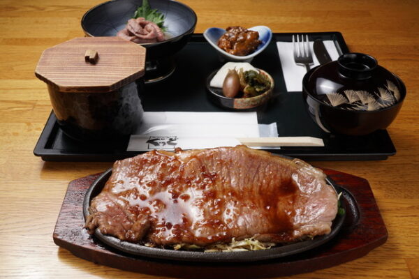 米沢駅前に店を構える「ステーキ 東洋館」は、落ち着いた雰囲気の中で厳選された米沢育ち黒毛和牛を味わえる老舗ステーキハウス。肩ひき、モモ、サーロインなど部位ごとに魅力の異なるステーキが揃い、シンプルに焼き上げた肉の旨みを存分に堪能できます。