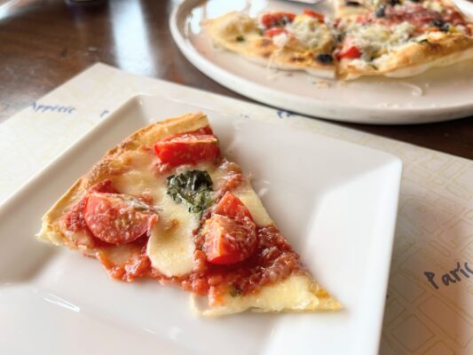 メニューには季節の野菜を使った前菜、ふわふわのオムレツ、チーズ料理、そして存在感のある薪釜ピッツァなど、どれを選んでも満足感のあるラインナップ。特に地元食材を使った料理や、焼きたてのピッツァは「香ばしくて美味しい」と好評です。
