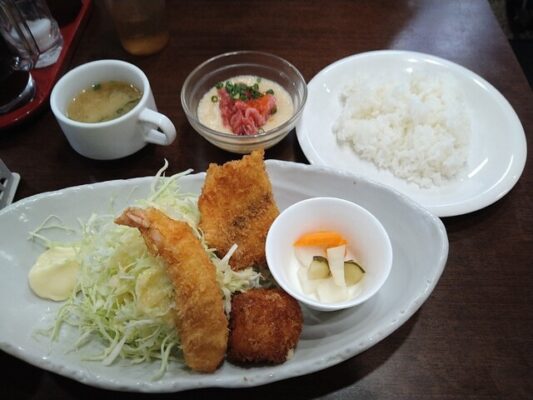 名物の海鮮系定食や丼は、どれも仕入れたばかりの新鮮な魚を使っており、食べる瞬間に「鮮度の良さ」がしっかり伝わる満足度の高さが魅力。サーモンいくら丼をはじめ、焼き魚、煮魚、フライなど、その日の気分で選べる種類豊富な定食が揃います。人気の天ぷらや南蛮、肉系の定食もあり、魚が苦手な人でも楽しめる“使いやすい定食屋”としても人気。