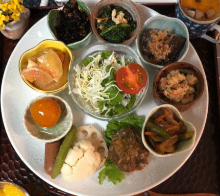 ランチは、和のおかずを少しずつ楽しめる「和楽ランチ」、野菜たっぷりで見た目もかわいい「しあわせランチ」、そして軽やかに楽しめる「サラダパンケーキ」など、身体を気遣ったメニューが並びます。お皿いっぱいに盛り付けられた家庭料理は、どれも野菜が多めでやさしい味わい。食後のドリンクも注文でき、ゆっくり過ごしたくなる満足感があります。