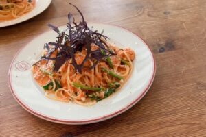 名物のパスタランチは、サラダ・パン・デザート・ドリンク付きで楽しめる満足感たっぷりのセット。パスタは、ベーコンと野菜のペペロンチーノや、あさりといかのトマトクリーム(+100円)などから選べ、どれも素材の香りや旨みを活かした味わいが魅力です。柚子こしょうや和風カルボナーラなど、気分に合わせて選べる多彩なラインナップも嬉しいポイント。