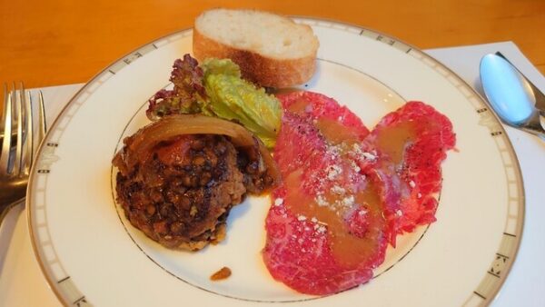 豊岡市元町にある「ハンバーグのビアドリット」は、ふわふわ食感が自慢のハンバーグ専門店。使用しているのは黒毛和牛のルーツとも言われる但馬牛で、旨みたっぷりの肉汁が広がる贅沢な味わいが楽しめます。