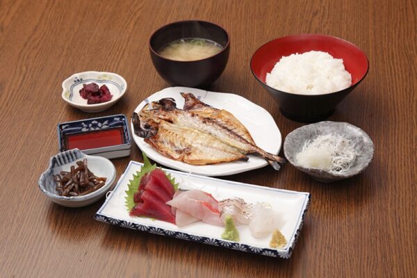 お店の魅力は、なんといっても新鮮な魚を使った定食の数々。あじひもの定食やさばみりん定食、あじたたき定食、本日の刺身定食などが並び、どれも丁寧に作られた家庭的な味わいが人気です。「楽しみ盛り定食」のように、ひものとお刺身が両方楽しめる組み合わせもあり、海の幸をしっかり味わいたい日にぴったり。