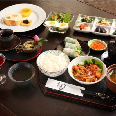 ランチでは、野菜料理を中心にしたセットが用意されており、数種類の野菜おかず、サラダ、味噌汁、ご飯、デザート、コーヒーまで揃う充実の内容。シフォンケーキが人気で、食後のひとときにぴったりのやさしい甘さが評判です。ベジタリアンメニューにも対応しており、体をいたわりたい日にもうれしい構成。