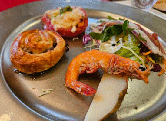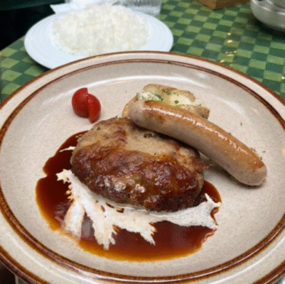 提供される料理は、自家製ハムやソーセージなど、素材を活かした洋食メニューが中心。特に人気の「ハンバーグとチーズ入りソーセージ」は、ボリュームがありつつ丁寧な味わいで満足度の高い一皿。セットのオードブルも好評で、丁寧に仕立てられた前菜が楽しめます。