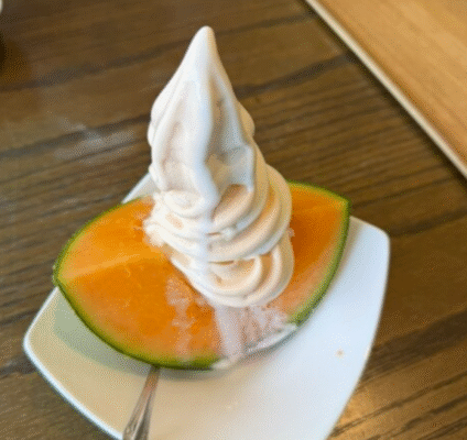 看板メニューの「サンタのヒゲ(メロン)」は、北海道・中富良野町のメロンを贅沢に使った人気のスイーツ。ジューシーなメロンに冷たいソフトクリームが重なり、贅沢な味わいを楽しめます。ほかにも、白身フライやからあげを挟んだコッペサンド、軽く食べられるピザなど、ランチにもおやつにも使いやすいメニューが揃っています。