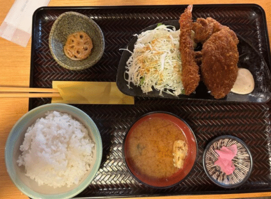 名物の「飛騨牛ミンチカツ」は、ジューシーな旨みがぎゅっと詰まった看板メニュー。サクッと揚がった衣の中に、飛騨牛の甘みとコクがしっかり感じられると高評価が集まっています。ほかにも「ミックスフライ定食」「エビフライ定食」「牛スジカレー」など、ボリュームと満足感のある定食が揃い、どれもご飯・味噌汁・香の物がセットになった安心感のあるラインナップ。