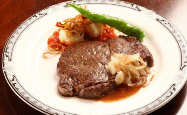 看板メニューは、圧倒的な存在感を誇る飛騨牛のステーキ。特にA5等級のサーロインは、口の中でとろけるような柔らかさと濃厚な旨みが魅力の一皿。ほかにも、香ばしく焼き上げられたヒレや赤身など、部位違いの味わいも楽しめます。付け合わせの「季節のサラダ」や「クリームコーンスープ」も評判が高く、メインを引き立てるバランスの取れた構成です。