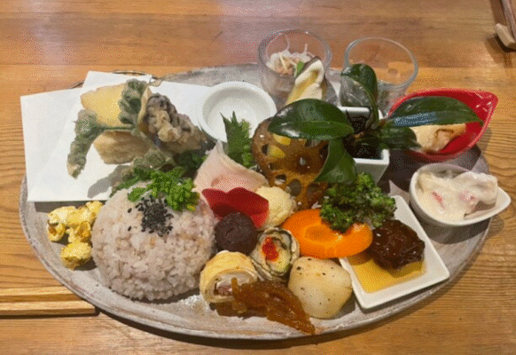 人気の「いろいろプレート」や「野菜の天ぷら」は、野菜サラダ・スープ・ごはんが付いた満足度の高いセット。ごはんは小豆入り玄米または直火で炊いた雑穀米から選べ、大盛り無料なのも魅力。また「季節の魚料理」もサラダやスープ付きで、野菜と魚のバランス良いランチが味わえます。