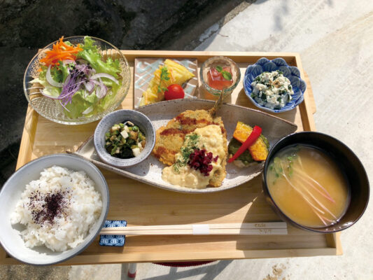 自家製のおひたしや煮込みハンバーグ、蒸し野菜、季節のサラダなど、ひとつひとつの料理が丁寧に作られており、どれもやさしく奥行きのある味わい。特に「季節の野菜スープ」は、トマトと玉ねぎのほどよい酸味と甘味が広がり、一口でふわっと元気が湧いてくる一品です。
