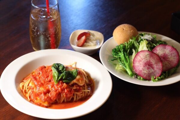 ランチで人気なのは14時まで注文できるパスタセット。菜園風、きのこのトマトクリーム、たらこのきのこクリーム、和風きのこ、ミートソース、ガーリックオイル、ナポリタンなど、種類豊富で気分に合わせて選べるのが魅力。どれも家庭的な温かさがあり、ほっとする味わいです。