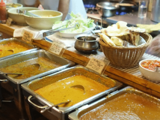 東武東上線大山駅南口から徒歩約3分、ビルの2階にある1998年創業の老舗ネパール料理店です。ランチタイムは開店と同時に賑わう人気のビュッフェスタイルで、日替わり4種類ほどのネパールカレーにナン、サフランライス、サラダ、スパイシーな唐揚げ、ヨーグルトなどが1時間食べ放題で楽しめます。ネパールのダルカレーやバターチキン、野菜カレー、キーマカレーなど、どれもクセが強すぎず食べやすい味付けが特徴です。カレーがなくなると新しい種類が登場するので、何度訪れても飽きません。夜はネパールの定食「ダルバートセット」や干し肉「スクティ」、餃子の「モモ」など本格的なネパール料理を居酒屋感覚で楽しめます。1200円前後でこの充実ぶりは、大山エリア屈指のコストパフォーマンスといえるでしょう。