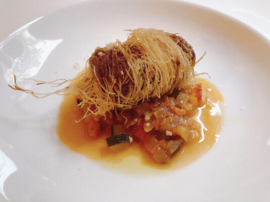 ランチでは、「トマト水とクリームチーズ ブザオラ」「キャビアエシャロット和え」「鯛のソテークミン風味」「マグレ鴨のコンフィ」「南欧野菜ラタトゥイユ添え」「鴨レバームースとトマトマリネ」「フランスホワイトアスパラつわぶき」「わらびとエビの冷製テリーヌ」「宇和島石鯛のパイ包み焼き」など、多彩な料理が並びます。
