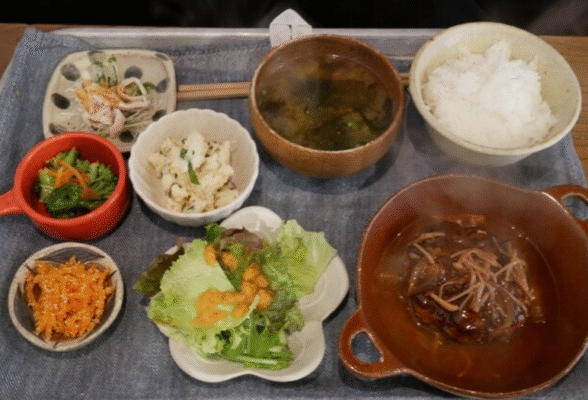 野菜はすべて国産を使用し、旬の野菜や旬の魚を中央卸売市場から仕入れるこだわりが魅力。毎日用意される日替わりのおかずはどれも素朴で優しい味わいで、飽きずに通いたくなる美味しさです。特にメンチカツはジューシーで人気の一品。ごはんと味噌汁がついた“これぞ食堂”という満足感のあるセットが楽しめます。