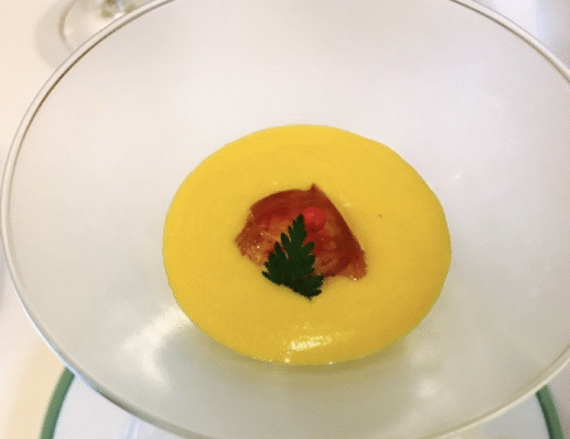 また、こちらで人気なのが季節の「南瓜スープ」。なめらかな口当たりとやさしい甘みが印象的で、料理への期待がさらに高まる一品。デザートも美しく、最後の一口まで幸せが続くフレンチ体験が楽しめます。