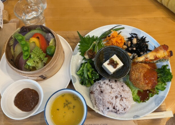 大阪府茨木市にある「KOTOYA CAFE」は、新鮮な野菜や発酵食品を使った身体にやさしいランチが楽しめる人気カフェ。店主は食育アドバイザーや発酵食スペシャリストの資格を持ち、丁寧に仕込まれたお惣菜や手作りのおやつが評判です。