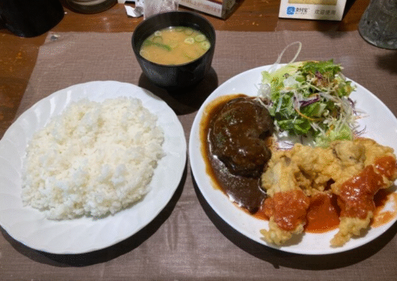名物のハンバーグ定食は、肉の旨みがぎゅっと詰まったふっくら食感が特徴。唐揚げ・白身フライ・生姜炒めなど、どこか懐かしい“町の洋食屋さん”らしい定番メニューが豊富に揃っており、どれを選んでも満足度の高い一皿が味わえます。