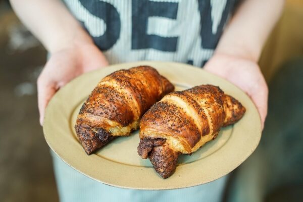 東京・中目黒で連日行列ができることで知られるベーカリーカフェが、熊本下通に初上陸したのがflour + water熊本です。熊本PARCOの跡地に誕生した商業施設HAB@熊本の1階にあり、通町筋電停からすぐという抜群の立地が魅力です。名物の「100 One Hundred」食パンは、小麦粉100%、水100%で作られた柔らかさが特徴の逸品で、天使のクロワッサンとともに店頭に並びます。ランチタイムには季節の食材を使ったパスタランチやふわふわのスフレパンケーキが楽しめ、夜はイタリアンバル「DRA7」として営業します。白を基調とした明るい店内には、色とりどりの花が飾られ、女性客を中心に人気を集めています。パンのテイクアウトもできるので、熊本土産としてもおすすめです。