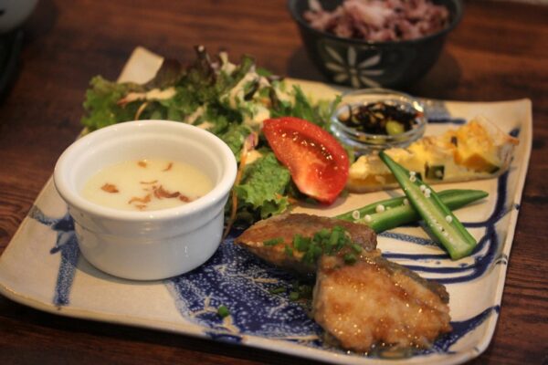 山口市滝町、県庁近くに位置する隠れ家的なカフェです。ブロック造りの古民家をリノベーションしたお店で、白い壁とアンティーク調の家具で構成したナチュラルな雰囲気が魅力です。萩焼のランプシェードの灯かりが優しい雰囲気を演出し、萩焼のプレートなど食器にもこだわりが感じられます。ランチは「きょうののお昼ごはん」の1種類で、メインは肉か魚から選べ、サラダ・スープ・野菜のおかずなどがワンプレートで提供されます。二十穀米のごはんや旬の野菜を使ったお弁当はヘルシーながらもボリュームもしっかりで、健康への気遣いが嬉しいと評判です。壁向きのカウンターやテーブル席、ソファ席もあり、様々なシーンで利用しやすい配置となっています。人気店のため予約してから行くのがおすすめです。大人好みのアンティークな魅力が詰まった山口市の人気カフェです。