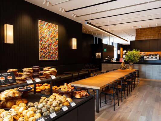 ニューヨーク発祥の人気ベーカリー&カフェ、THE CITY BAKERYが中之島フェスティバルタワー・ウエストの1階にあります。店内は天井が高く、モダンでスタイリッシュな内装が特徴です。名物のプレッツェルクロワッサンをはじめ、現地の味を再現したペイストリーやマフィン、クッキーなどが豊富に揃っています。しっかりとした食事メニューも充実しており、朝食からランチ、ディナーまで幅広い時間帯で利用できるのが魅力です。テラス席もあり、天気の良い日は中之島の街並みを眺めながら食事を楽しむことができます。おしゃれで活気のある雰囲気の中で、ニューヨーカー気分を味わいたい方におすすめのスポットです。