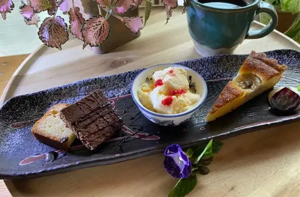 三毳山のふもと、緑に囲まれた築50年以上の古民家を改装したカフェです。店名はフランス語で「喜び」を意味し、体にやさしい食事を届けたいという店主の想いが込められています。有機野菜と国産小麦にこだわり、ランチはほろほろに煮込んだ骨付きチキンのマスタードクリームソースや、ブルガリア料理をアレンジしたカヴァルマ風ハンバーグなど5種類ほど。雑穀米か自家製パンを選べるのも嬉しいポイントです。自家製酵母やライ麦を使ったパンも人気で、特にシナモンロールは売り切れ必至の逸品。甘さ控えめのかぼちゃチーズケーキなどスイーツも充実しています。JR岩舟駅からタクシーで約5分、佐野SAスマートインターからは車で約3分。人気店のため予約がおすすめです。