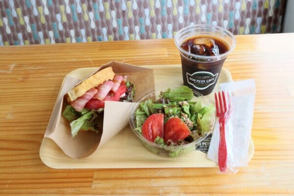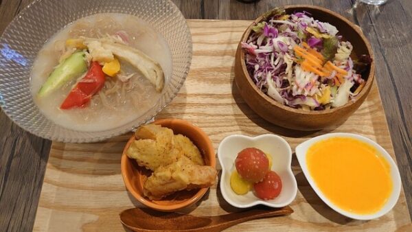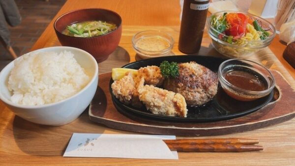 メニューには、「塩麹に付けたササミと季節野菜の天ぷら」「手作り醤油麹で食べるローストポーク」など、こだわりの食材を使用した料理が揃い、サラダや副菜もバランスよく楽しめます。セットドリンクにはコーヒーや紅茶が選べ、落ち着いたカフェ時間を過ごすのにもぴったり。