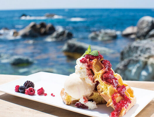 フードメニューは幅広く、見た目にも食欲をそそるプレートが並び、季節のスイーツやパフェなども充実。焼きたてパンの香りがふわりと漂い、カフェらしい心地よい空気が流れるのも魅力です。海沿いの立地を生かしたピクニックテーブルもあり、外で潮風を感じながらのんびり過ごすのもおすすめ。