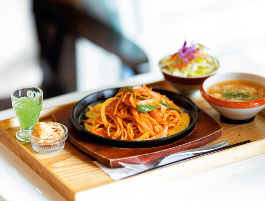 店内では、発酵食を取り入れたランチや、昔ながらの喫茶店を思わせるナポリタンなど、やさしい味わいの料理を楽しめます。サイドメニューにはパウンドケーキや、ラムレーズンを使ったスイーツ、チーズトーストなどが並び、食後にちょっと甘いものを楽しみたいときにもぴったり。