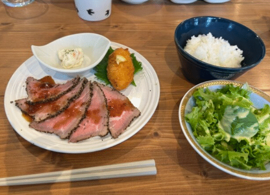 「なないろカフェ」は、尼崎市開明町にある落ち着いた雰囲気のカフェで、ランチからカフェタイムまで幅広く利用できる便利な一軒です。人気の「自家製ローストビーフランチ」は、写真でもわかるしっとりとしたローストビーフが魅力で、バランスよく楽しめる内容が好評。