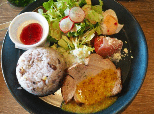 尼崎市南塚口町にある「ナンバーファイブカフェ」は、しっかり食べたいランチ派にも、気軽に立ち寄りたいカフェ利用にもぴったりのお店。写真のメニューでは、選べるメインにライ麦パンまたは雑穀米が付く「Plate Lunch」が手頃で人気。蒸し鶏のスイートチリソースなど、バランスよく食べられる内容が魅力です。