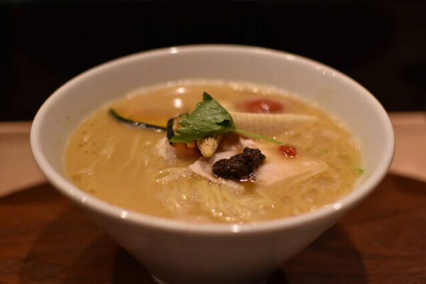 銀座で行列必至のラーメンディナーを楽しむなら「銀座 篝 本店」がおすすめです。銀座駅から徒歩3分、ラーメンというジャンルを超えた”和のスープ料理”として、食通たちを唸らせる人気店。銀座の篝では、鶏と魚介の旨みが凝縮された透き通ったスープが特徴で、上品な味わいは銀座の高級店での食事後の2軒目にも最適です。看板メニューの鶏白湯SOBAは、濃厚ながらも後味すっきりで、トリュフオイルをかけることで一気に高級感が増します。銀座ディナーで「カジュアルだけど特別感がほしい」という方にぴったり。麺は細麺から太麺まで選べ、トッピングも豊富で自分好みにカスタマイズできます。店内はカウンター席中心のシンプルな造りで、ひとりでも気軽に入店できる雰囲気。夜でも行列ができることが多いですが、回転が早いのでそれほど待たずに入れます。銀座で新しいラーメン体験を求めるなら、篝で決まりです。