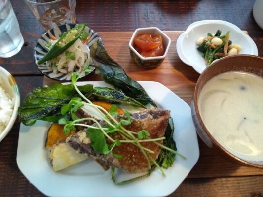 メニューには、チキンのソテー フレッシュトマトソースや、いわしのフライ 味噌ヨーグルトソースといった週替わりランチが並び、前菜やスープ、ごはん、小さなデザートがセットになった満足感のある内容。季節限定の構成もあり、訪れるたびに新しい味に出会えるのも魅力です。ほかにもコーヒーや水出しアイスコーヒー、アールグレイティー、りんごジュースなどのドリンクがあり、食事にもカフェ利用にも使いやすいラインナップとなっています。