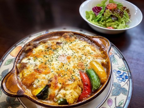 ランチは「本日のランチ」や「カレーランチ」、「ピザランチ」などがあり、メインに加えてサラダやスープがセットになったバランスの良い構成。色とりどりの野菜が使われたプレートは見た目にも楽しく、カフェらしいやさしい味わいをゆっくり堪能できます。