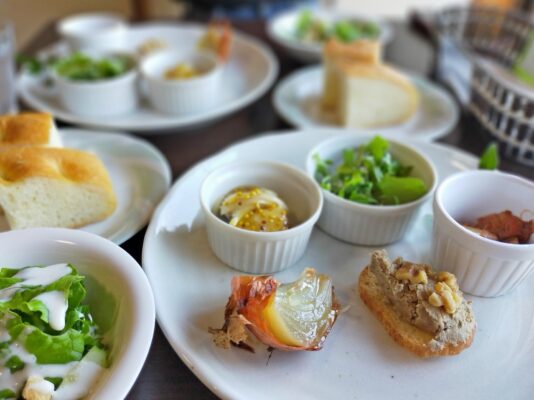 人気のカスタードプリンをはじめ、前菜が並ぶランチコースや、5種類を楽しめるカフェセットなど、見た目にも華やかなメニューが揃っています。丁寧に盛り付けられた料理は、食べる前から気分が上がる魅力があり、口コミでも“隠れ家風でゆったり過ごせる”と評判。
