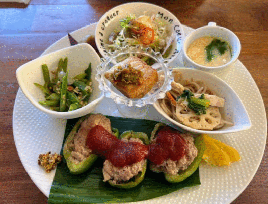 提供されるランチは、素材の味を大切にした優しい味わいが特徴。仕込みから丁寧に作られており、季節の野菜をふんだんに使ったメニューはどれも滋味深く、健康志向の方にも人気です。また、店内では自然酵母を使った自家製パンの販売も行っており、こちらを目当てに訪れる人も多いのだとか。