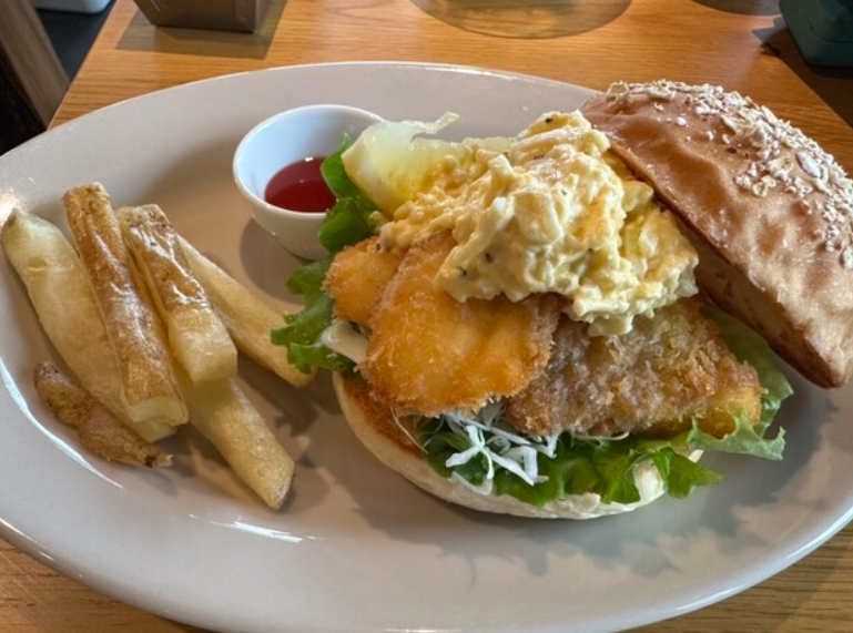 看板メニューは、瀬戸内ならではの味わいが楽しめる「瀬戸内鯛カツバーガー」や、地元食材を使った「じゃこ天バーガー」。どちらもここでしか味わえない個性あふれる一品で、観光客からも人気のメニューです。テイクアウトにも対応しており、道後散策のおともにちょうど良いのも魅力。